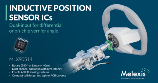 Melexis announces the MLX90514, a dual-input inductive sensor integrated circuit (IC). The novel device simultaneously processes signals from two sets of coils to compute differential or vernier angles on-chip. This sensor is designed for next-generation automotive applications, particularly in systems such as steering torque feedback, steering angle sensing, or steering rack motor control (including steer-by-wire implementations).