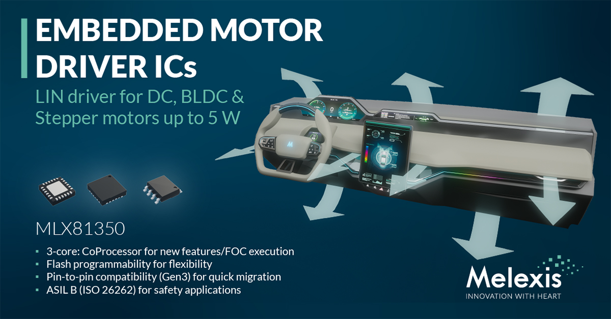 Melexis introduces the MLX81350, its fourth-generation, automotive LIN motor driver delivering up to 5 W (0.5 A) per motor. Designed for air conditioning flaps and automated air vents in electric vehicles (EVs), the cost-effective MLX81350 combines quiet, efficient motor operation with simplified system integration and trusted reliability.